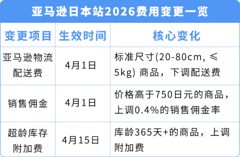同样从4月1日起,亚马逊日本站部分商品的销售佣金小幅上调,标准尺寸商品的物流配送费有所下调,但超龄库存附加费提高了。