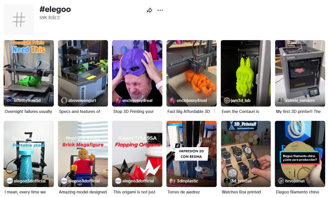 标签布局多元且精准:每条视频均搭配#3dprinting、#diy、#asmr、#elegooprinter等多领域标签,既覆盖3D打印核心圈层,也触达DIY、解压、科技等泛兴趣圈层。