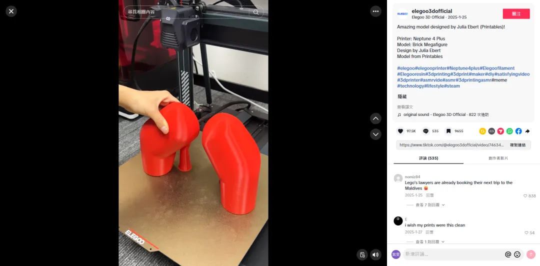 内容形式统一且精准:账号所有内容均聚焦“沉浸式打印全过程”,镜头聚焦打印机实操细节,搭配解压音效,既贴合TikTok用户对视觉冲击、解压内容的核心偏好,又能自然植入ELEGOO设备。