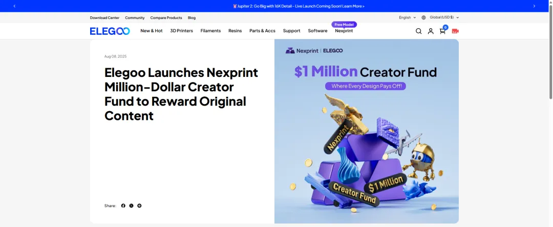 2025年,ELEGOO设立100万美元创作者基金,审核通过投稿每月可获5美元奖励,优秀设计额外获奖,补齐3D模型内容供给;同时发起10周年UGC活动,奖池包含旗舰打印机、优惠券,激活用户原创内容传播,形成“用户创作-品牌传播-用户复购”的闭环。