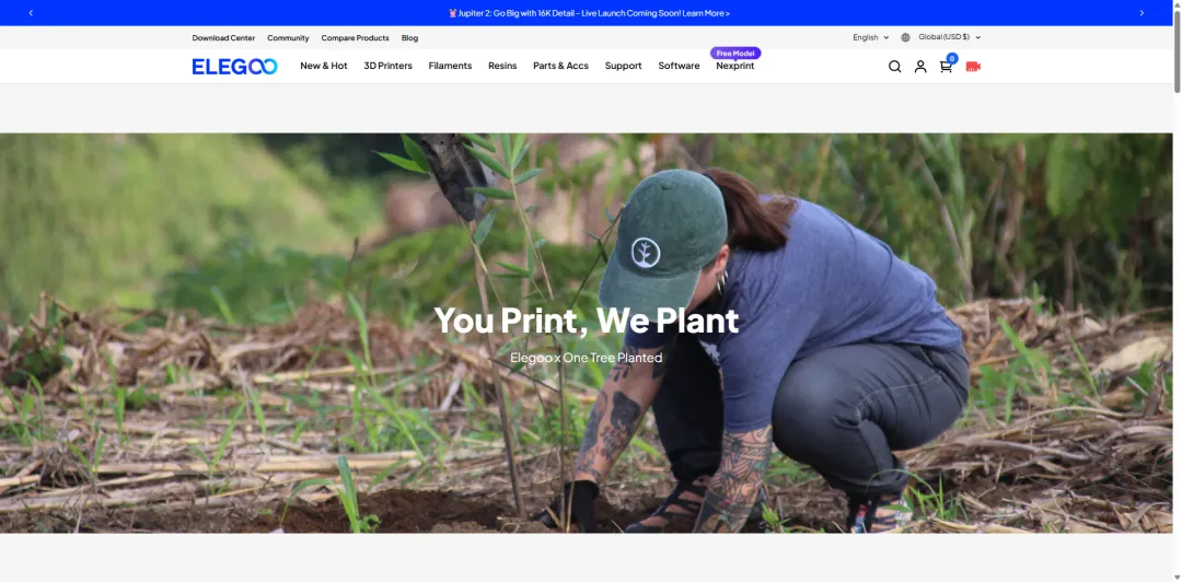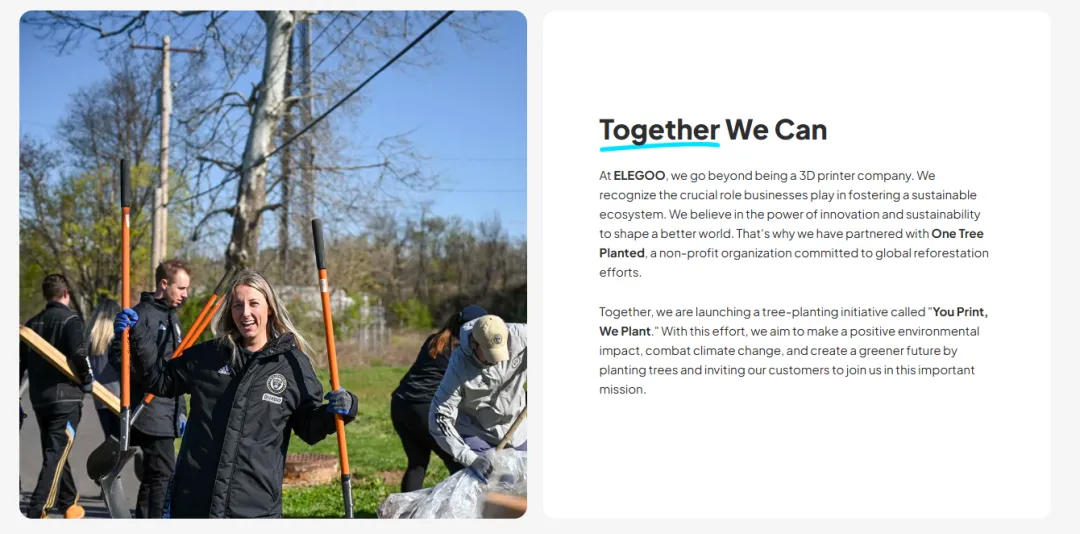 ELEGOO发起“ You Print, We Plant ”长期环保项目,与全球环保机构One Tree Planted合作,用户每打印一次,品牌就捐赠资金用于植树,官网上线独立项目页,清晰传递“消费即参与环保”的理念。