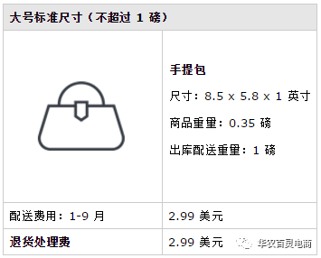 我们以一件出库配送重量为 1 磅且在 1-9 月期间售出的手提包为例。这笔交易的亚马逊物流配送费用为 2.99 美元。如果买家决定退回该商品,则您需要支付2.99 美元的退货处理费。