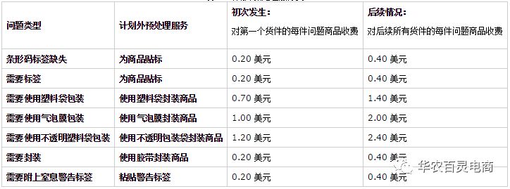 如果运送到亚马逊的商品没有经过妥善预处理或贴标,就需要在亚马逊运营中心实施计划外预处理服务,例如贴标或塑料袋包装。目前,亚马逊物流对以下计划外预处理服务收取费用: