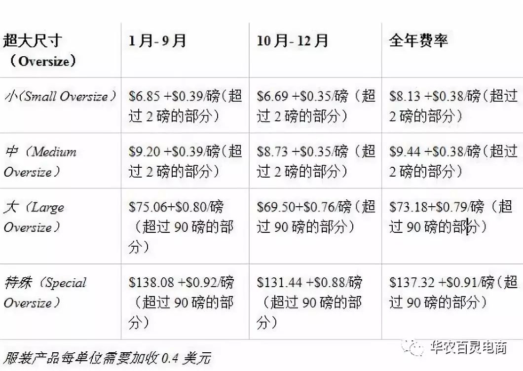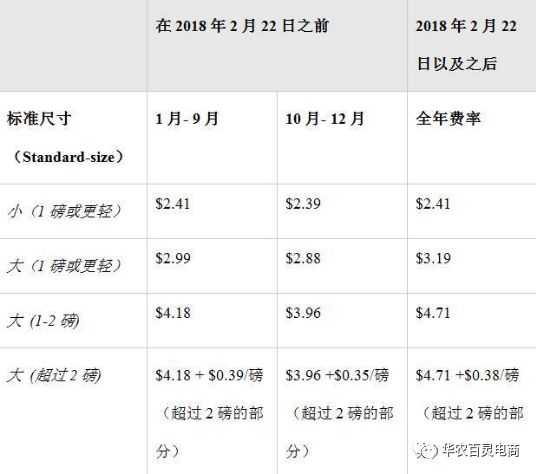 FBA Fulfillment Fee(执行费):亚马逊对大多数尺寸和重量的产品调整执行费,如下图所示,大家可根据官方尺寸计算产品相应的费率,调整后的费用将适用于全年,2018年10月到12月之间不再推出单独的FBA费率。