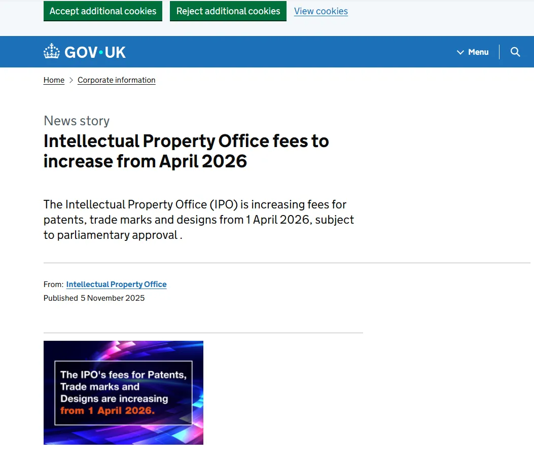 官方通知:英国知识产权局拟在2026 年 4 月 1 日起提高专利、商标和外观设计的费用