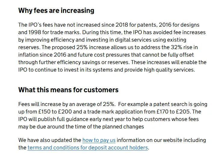 费用平均将上涨 25%。例如,专利检索费用将从 150 英镑上调至 200 英镑,商标申请费用将从 170 英镑上调至 205 英镑。知识产权局将于明年初发布完整指南,为那些费用可能在计划调整时段内到期的客户提供帮助。
