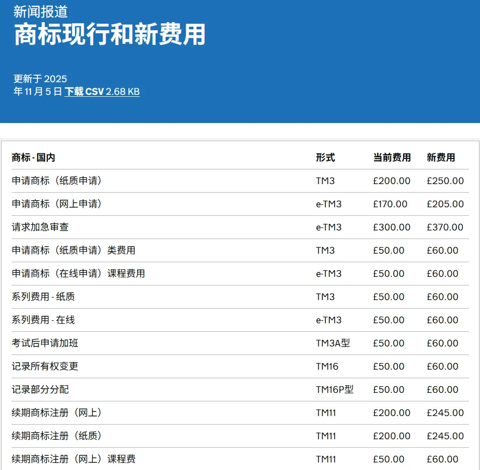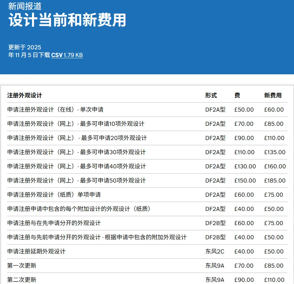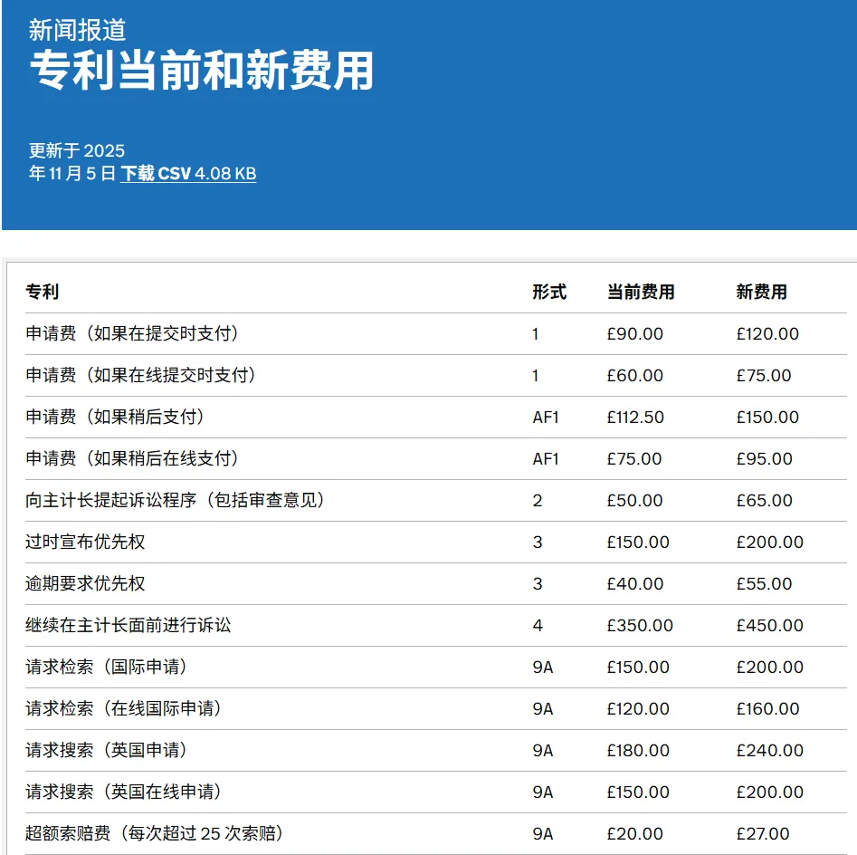 当地时间11月5日,英国知识产权局在其官网上宣布,将从2026年4月1日起提高专利、商标、和外观设计的费用。