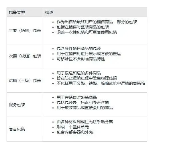 PPWR 覆盖了所有类型的包装:直接盛装商品的销售包装(如产品盒、瓶子)、用于组合展示的成组包装、运输过程中使用的外箱和填充材料、销售时提供的服务包装(如包装袋),以及多种材料组成的复合包装,且不区分行业和 B2C、B2B 销售模式。