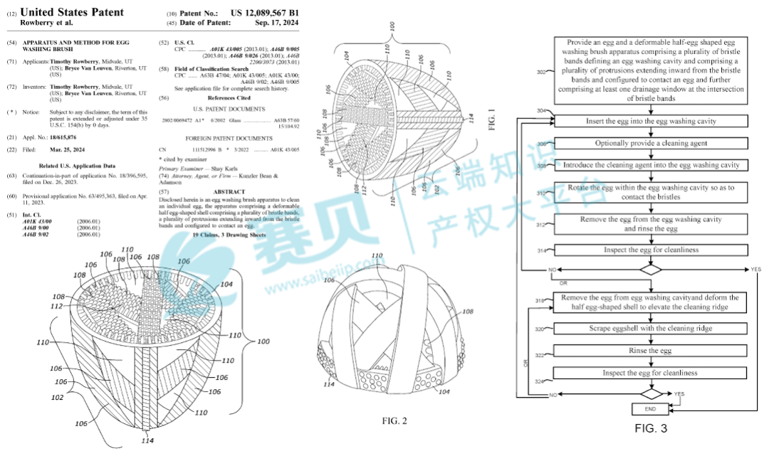 涉案专利US12089567是“APPARATUS AND METHOD FOR EGG WASHING BRUSH”——蛋清洗刷的装置和方法,于2024年3月25日提交申请,并在2024年9月17日获得美国专利授权,其保护范围内容为鸡蛋清洗刷的装置及方法。