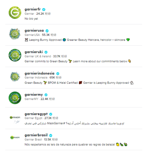 首先,他们在TikTok上建立自己的品牌阵地,品牌出海TikTok,打造品牌阵地是必不可少的重要第一步。有了官媒账号才会有源源不断的免费流量涌入,在提高品牌曝光的同时也提高了转化。不仅如此,他们还拥有自己的账号矩阵,其中,最多的粉丝账号是@garnierindonesia到目前为止,累计6万+粉丝数。
