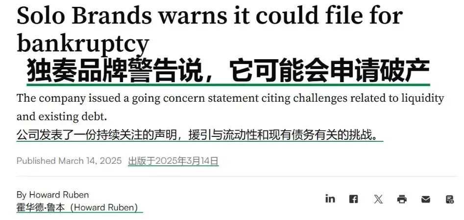 近日,曾在亚马逊风光无限的头部户外品牌Solo Brands收到纽约证券交易所的退市通知,因其A类普通股股价持续低于1美元,触发相关规定。尽管它有权申请复审,但财务状况让退市成定局。