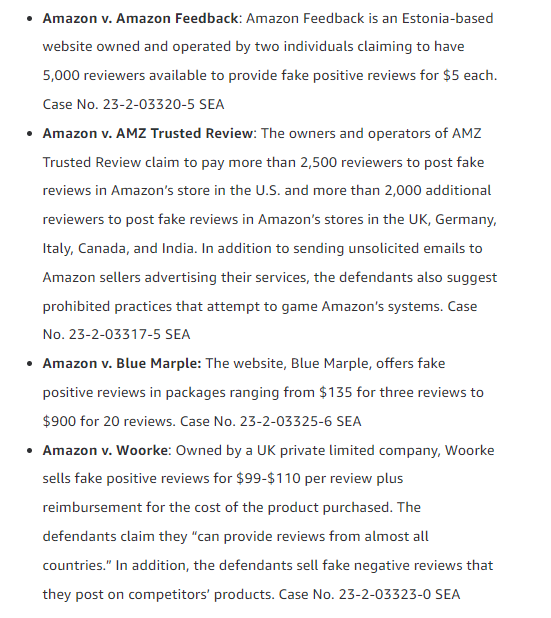 公告显示被告除了出售虚假正面评论外,还可以提供来自几乎所有国家的负面评论。收费从 3 条评论 135 美元到 20 条 900 美元不等。