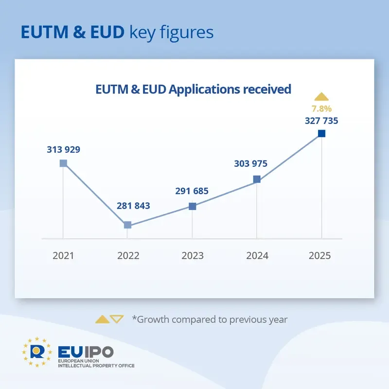 在2025年,欧盟知识产权局(EUIPO)收到327,735份新的欧盟商标和欧盟设计申请。这是自1996年该局开始接受申请以来,知识产权(IP)申请的最高年度数量。总体而言,与2024年相比,增长了7.8%,超过了2021年创下的前纪录(收到313,928份申请)。