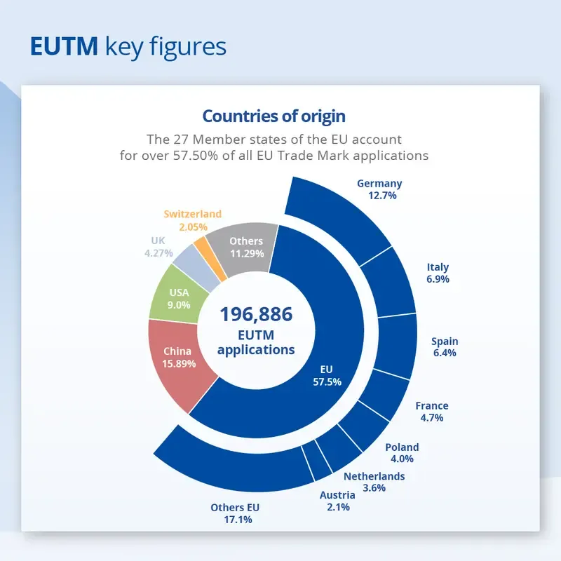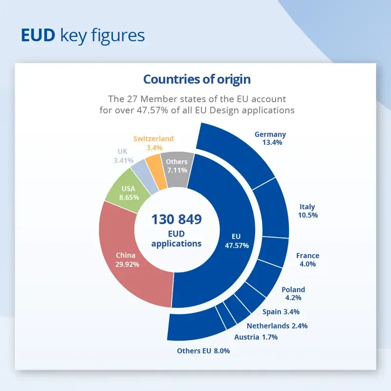 在欧盟内部,设计申请主要来自德国(13.4%),其次是意大利(10.5%)、波兰(4.2%)、法国(4%)和西班牙(3.4%)。