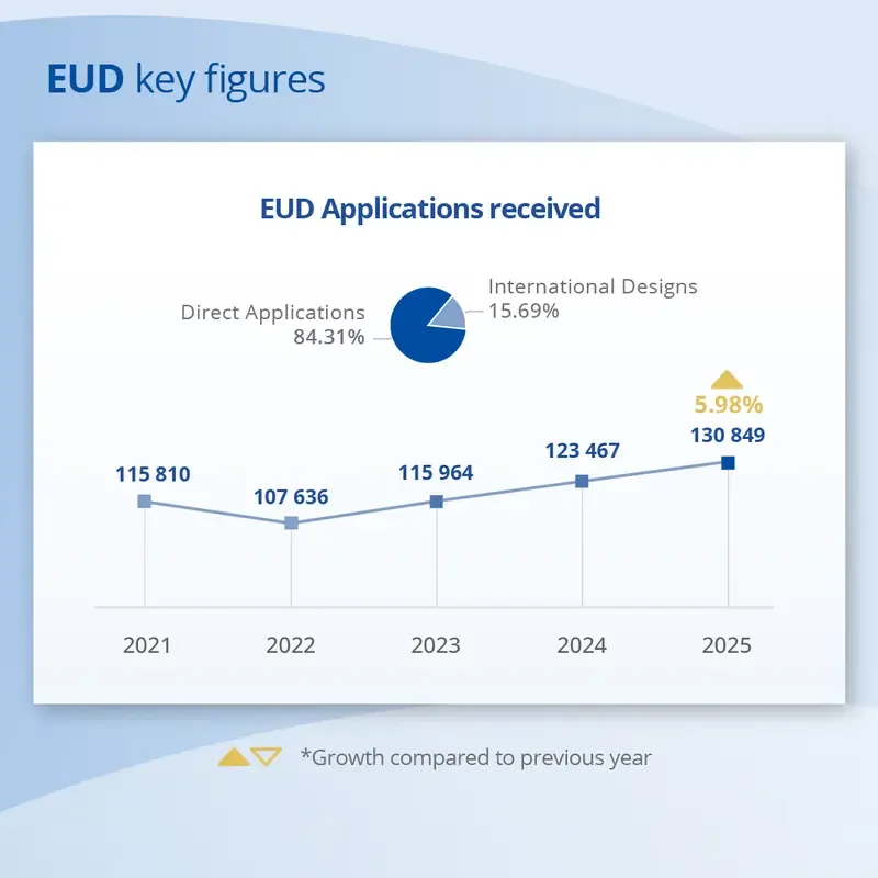 2025年,欧盟设计(EUDs)的需求也有所增加。欧盟知识产权局(EUIPO)收到130,849份设计申请,同比增长6%,这是连续第二年创下历史新高。