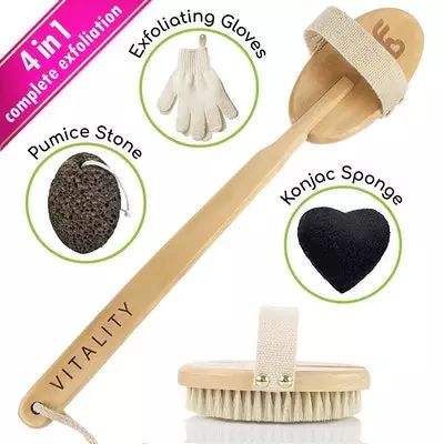 这款活力去角质套装可使皮肤,淋巴活动,促进弹性和生长所需。它有一个莲花木和公猪鬃毛刷,带有可拆卸的手柄,因此可到达手难以触及的地方,它甚至还带有去角质手套,魔芋海绵和浮石,可以去除几乎无处不在的死皮。该产品除了在排行榜飙升很快之外,还拥有超过千条评论,评价星级更是高达4.8星。