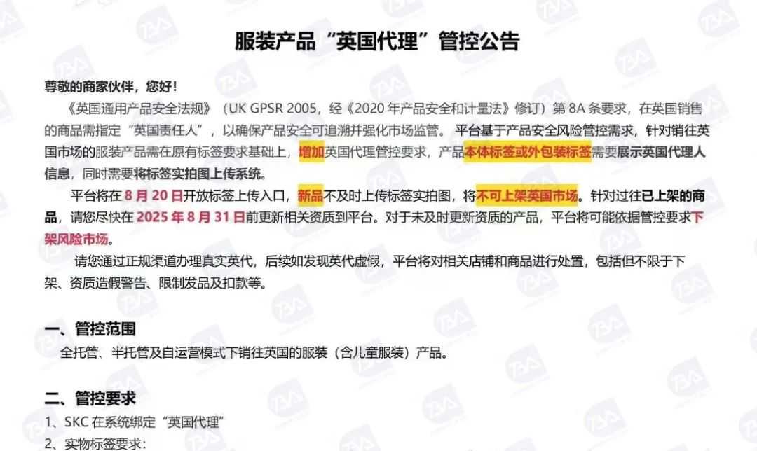 根据《英国通用产品安全法规》(UK GPSR 2005,2020 年修订)第 8A 条,非英国制造商想在英国销售商品,必须指定英代,这是硬性法规要求,并非 SHEIN 平台单独规定。(在此之前,temu平台已发布英代合规的通知。)