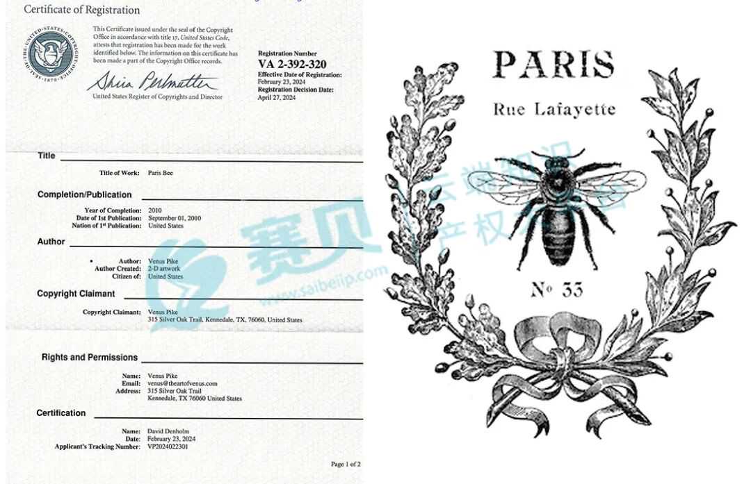 此次维权的核心为 Venus Pike 创作的艺术作品《Paris Bee》,融合复古与艺术感,常以细腻的线条和经典的元素组合,营造出具有历史韵味与艺术氛围的视觉效果。赛贝提醒:即使仅使用《Paris Bee》的部分设计元素(如蜜蜂轮廓、背景街道线条),或对图案进行轻微修改,只要与原作品核心视觉特征一致,仍可能被认定为 “实质性相似”,构成侵权。