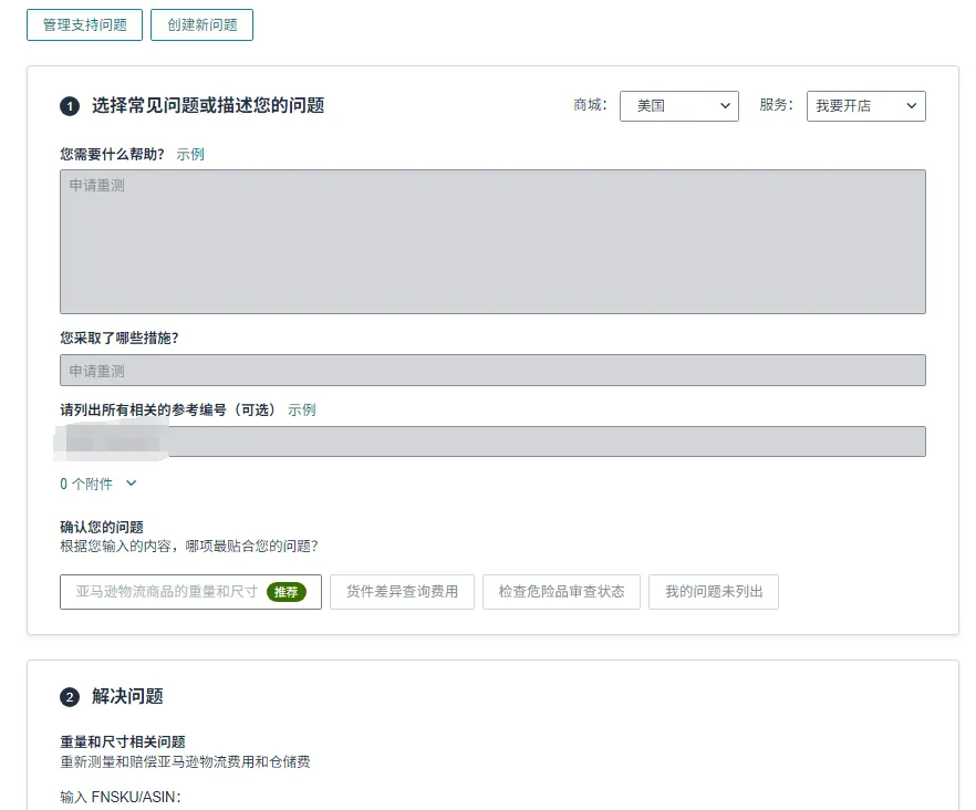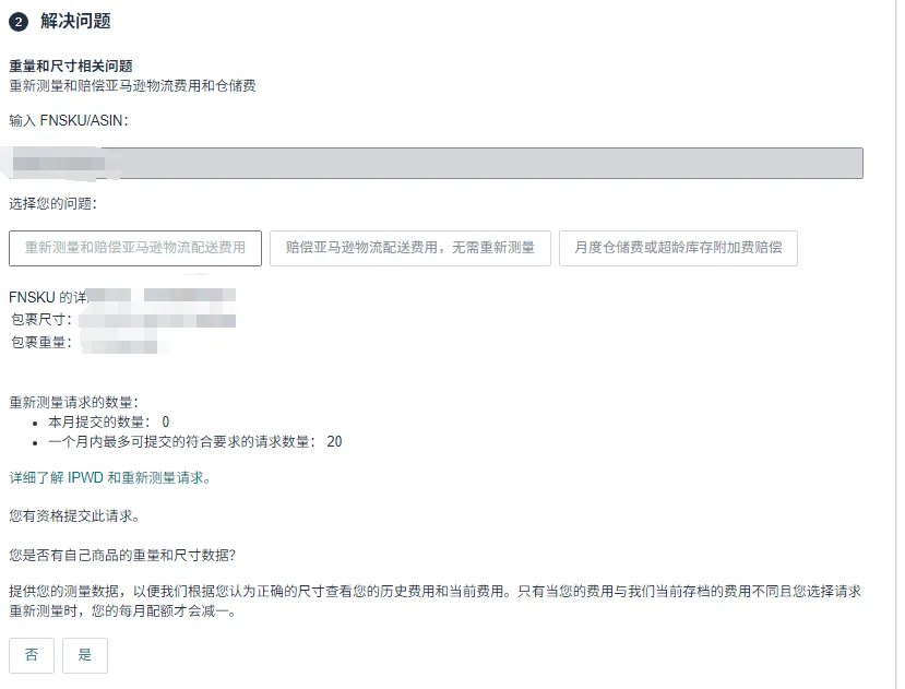 在问题解决页面,输入产品的 FNSKU(ASIN 也可辅助提供),明确告知需要重新测量重量和尺寸
