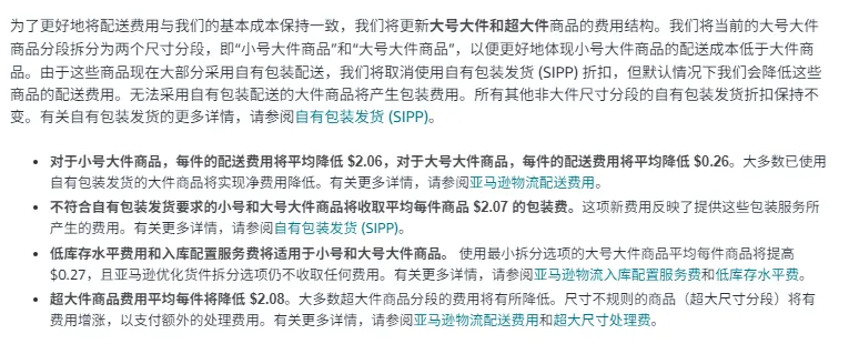 取消 “自有包装发货(SIPP)” 折扣,但默认配送费已降低;不符合 SIPP 要求的大件,每件要收 $2.07 包装费;