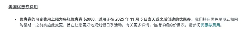 2025 年 11 月 5 日及之后创建的优惠券,可变费用上限为每张 $2000,刚好覆盖黑五、网一促销;