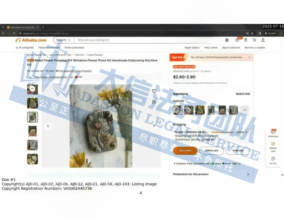 此案为版权维权,目前已冻结267家店铺,版权号:VA 2-445-736,涵盖33个植物主题压花机产品,以下是涉及版权的具体信息,未经授权不可擅自使用,侵权风险极高,跨境卖家尽快检索下架,避免造成更大的侵权损失!