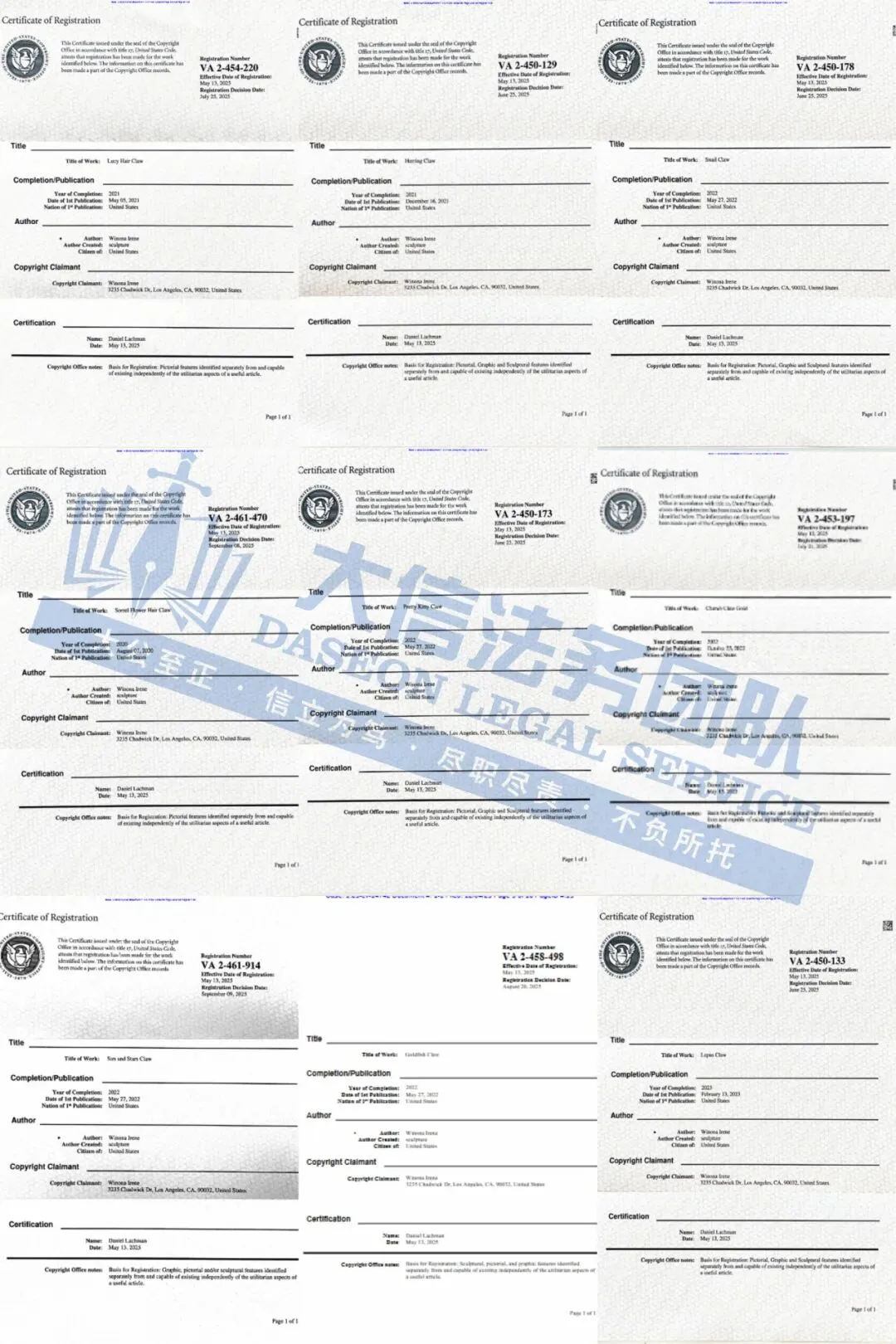 此案为版权维权,涉及9张版权作品,版权号:VA 2-453-197、VA 2-458-498、VA 2-450-129、VA 2-450-133、VA 2-454-220、VA 2-450-173、VA 2-450-178、VA 2-461-470和VA 2-461-914,均于2025年5月下证,以下是涉及版权的具体信息,未经授权不可擅自使用,侵权风险极高,跨境卖家尽快检索下架,避免造成更大的侵权损失!