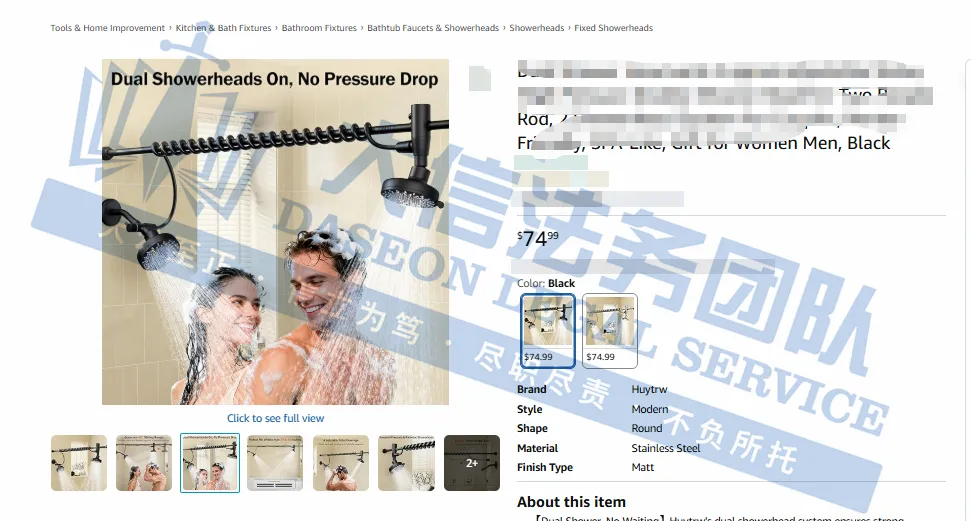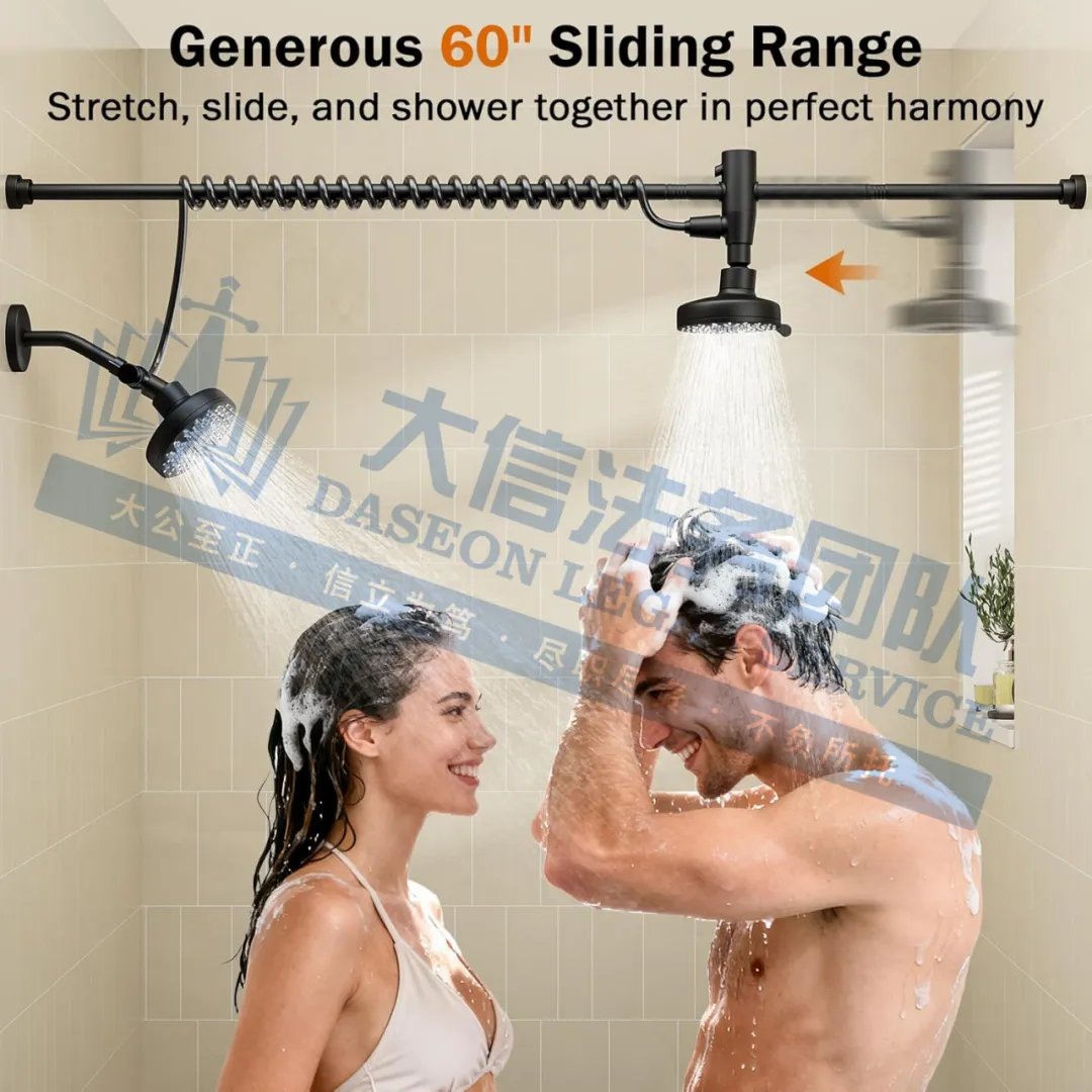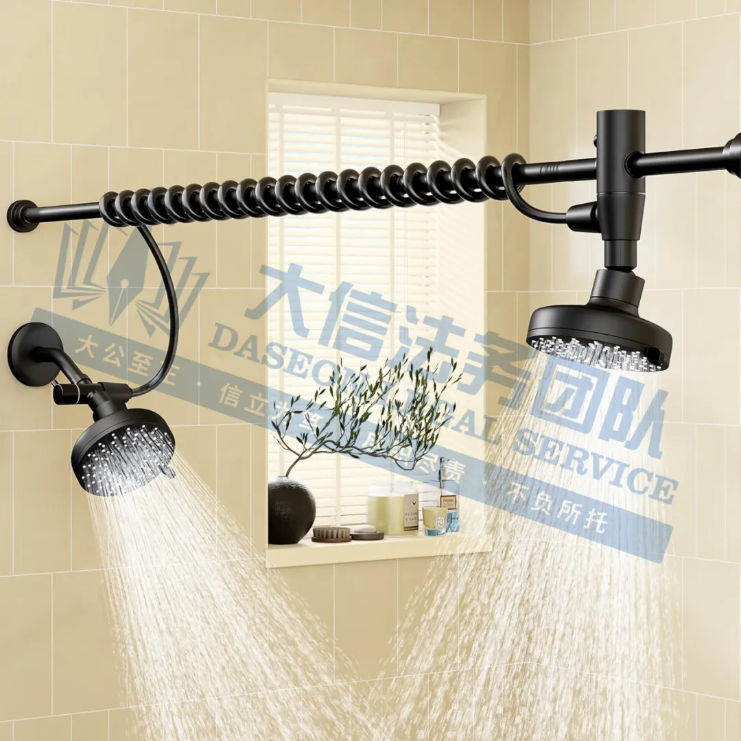原告是来自广东的国人卖家,针对家庭双人淋浴的需求而研发了两款专为两人同时使用设计的淋浴设备,集成了多项功能与人性化设计,旨在提升沐浴的舒适度、便捷性和趣味性。双人淋浴设备配备了两个独立喷头,采用双顶喷设计,可支持两人同时使用,有效避免等待时间,提升了沐浴效率的同时增进家庭互动。