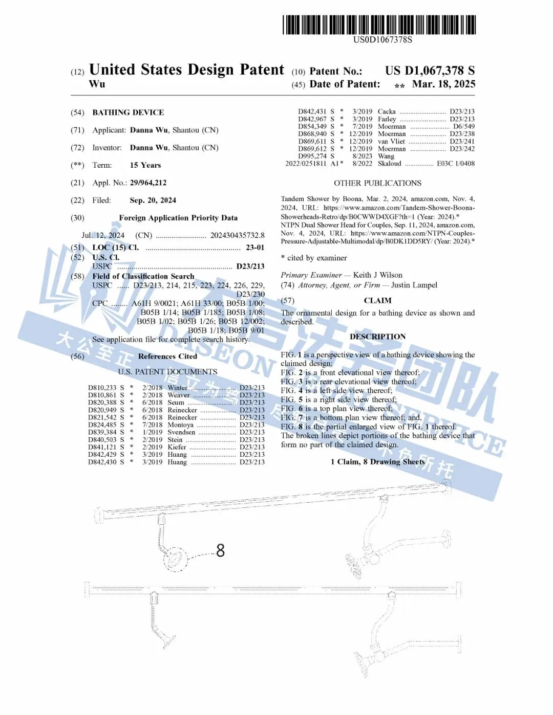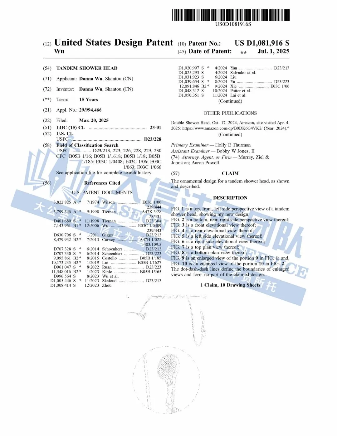 此案为专利维权,涉及2项双头沐浴的外观专利产品,专利号:D1067378、D1081916,分别于2025年3月18日和2025年7月1日下证,注意,只要外观相似,都会有侵权风险!以下是涉及专利的具体信息,未经授权不得擅自使用,侵权风险极高,跨境卖家尽快检索下架,避免TRO侵权风险!