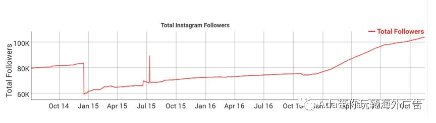 但如果你看到目标网红的图表出现巨大跌幅和尖峰,就像下图这样,目标网红很可能已经买过粉丝来夸大他们的粉丝数量。