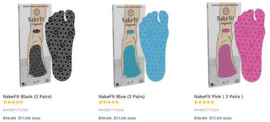 原告NakeFit USA, LLC.成立于2017年,其主打产品NAKEFIT沙滩隐形鞋是一款脚掌形状的粘合鞋垫,比人字拖、凉鞋或水鞋更加简易方便。品牌官网为:https://nakefit.us/,下图是其官网上所展示的产品截图: