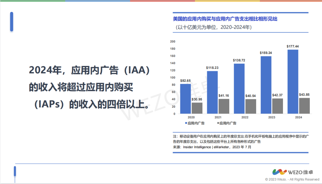 从数据来看,2022年美国移动应用内广告(IAA)收入为1387亿美金,而应用内购买(IAPS)收入为405亿美金。预估到2024年,这个差距会拉开四倍以上。