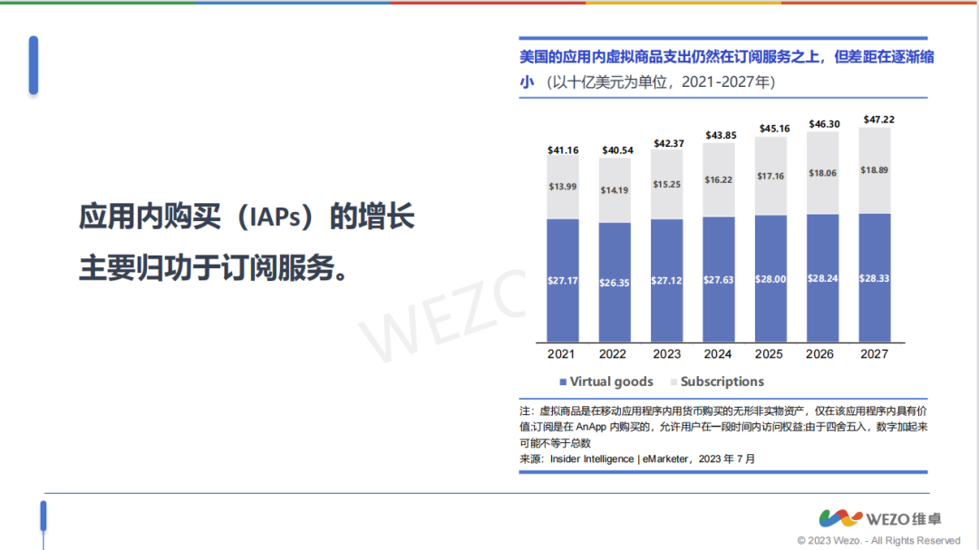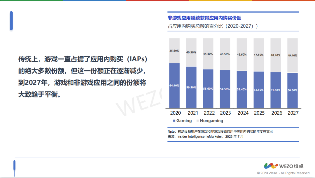 以往在应用内购买部分,游戏应用一直占比较重,毕竟游戏圈流行“不氪金不好玩”的说法。但是从新冠疫情开始,游戏应用内购买占比持续下滑;到2027年,游戏和非游戏应用之间的份额将大致趋于平衡。