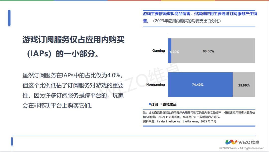 从数据上看,游戏订阅服务至占应用内购买的4%,这与实际情况并不相符。游戏主要依赖虚拟商品销售,一款游戏经常是跨平台销售的,许多游戏玩家会在非移动平台上购买它们。