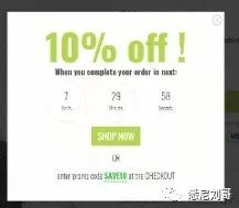 在访问者即将离开关闭你的网站页面的时候,此窗口会跳出,给出更有诱惑力的折扣优惠,吸引他并重新产生购买欲,可以提供百分比折扣或金钱直接折扣。 我们还包括一个可选的倒数计时器,这里再次利用心理暗示。