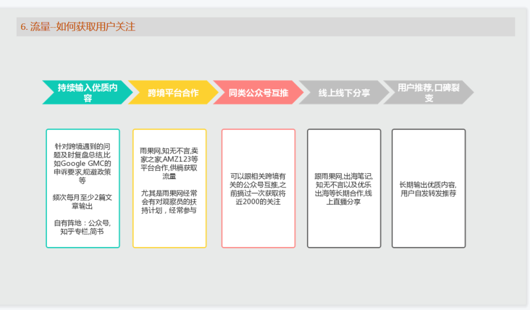 下面主要列的一些获取关注的方法,我也是佛系运营平时也不怎么打理, 目前除了主动搜索之外,大部分都是来自知无不言跟知乎专栏,知乎专栏过来的很多都比较厉害。其他就互推呀,跟其他跨境平台合作,参加一些线上线下的活动分享等等之类的,也是个比较不错的办法。
