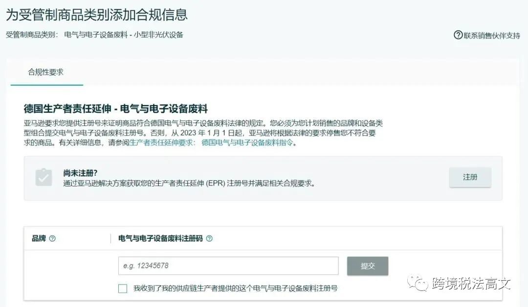 亚马逊卖家平台的生产者责任延伸合规信息页面已开放德国电气与电子设备废料注册号(WEEE-Reg.-Nr号)的上传通道。 复制以下链接至浏览器,登录亚马逊卖家平台完成上传: https://sellercentral-europe.amazon.com/spx/myc/epr-compliance?ref=email_compport_epr1_1-1comm 德国WEEE,哪里有靠谱的服务商? 亚马逊生产者责任延伸服务(ACES)已正式开放给所有卖家。 复制以下链接至浏览器,登录亚马逊卖家平台进行报名: https://sellercentral-europe.amazon.com/ce-epr-registration/index.html#/sign-up?ref=EPR_WEEE_wechatpost_ACES 哪些商品是属于德国电气与 电子设备废料指令 (WEEE)法律所管辖的呢? 德国WEEE指令适用于所有受电气与电子设备废料指令管辖的商品(法律明确排除的除外),如果您的商品设计是使用了电压为,交流电最大 1,000 伏特或直流电最大 1,500 伏特,并且 依靠电流或电磁场才能正常工作,或者 用于产生、传输和测量电流和电磁场,则该商品会被视为受电气与电子设备废料指令管辖的商品。 这些商品可能包括使用电池的商品,前提是它们得符合上述条件。但是,独立电池需遵守《德国电池法》,因此不受德国电气与电子设备废料指令法律管辖。 有关德国电气与电子设备废料指令法律所涵盖的商品范围的更多信息,请参阅 EAR 提供的信息: https://www.stiftung-ear.de/en/topics/elektrog/producers-ar/scop 上传我的WEEE-Reg.-Nr号有哪些步骤? Step1 ✦ 复制以下链接至浏览器,登录亚马逊卖家平台,前往生产者责任延伸要求:德国的电气与电子设备废料指令帮助页面,查看每种设备类型的合规门户链接。 https://www.sellercentral.amazon.dev/gp/help/GY97WLQDLFH2SNBY (点击查看大图👆) Step2 ✦ 点击对应链接,查看每种特定设备类型中需要提供WEEE-Reg.-Nr号的品牌。 Step3 ✦ 打开首个链接后,请在打开文本框中插入您想要注册的品牌WEEE-Reg.-Nr号(可以是您自己的注册号,也可以是您商品的生产者的注册号)。 (点击查看大图👆) Step4 ✦ 如果您是转销商,并且使用的是您商品生产者的WEEE-Reg.-Nr号,请选中内容为“我收到了我的供应链生产者提供的这个电气与电子设备废料注册号”的复选框。 Step5 ✦ 点击“提交”。 Step6 ✦ 针对您在亚马逊德国商城销售的该类型设备的所有品牌,请重复执行第3~5步,务必确保您查看了所有分页(每页最多显示5条记录)。 Step7 ✦ 对于要求提供WEEE-Reg.-Nr号的所有类型的设备,请重复第1~6步。 德国电气与电子设备废料指令合规门户中的各字段是什么意思? 对于您在“为受管制商品添加合规性证明”页面上看到的主要字段,以下是这些字段的说明: 联系销售伙伴支持:点击此按钮,获得亚马逊官方支持团队的帮助。 受管制商品类别:这是要求提供WEEE-Reg.-Nr号的设备类型。如果您通过其中一个链接打开相关页面,则系统会预先填写内容。如果您是从合规门户打开相关页面,则需要从下拉菜单中选择一个设备类型。 注册:点击此按钮即可获得注册生产者责任延伸的支持。 品牌:在此列中,您将看到相关设备类型中需要提供WEEE-Reg.-Nr号的所有品牌。 “注册号”列中的开放式文本框:您可以在此处为每个品牌设备组合输入您的WEEE-Reg.-Nr号。 “我收到了我的供应链生产者提供的这个电气与电子设备废料注册号”复选框:如果您是转销商,且提供的是您商品生产者的WEEE-Reg.-Nr号,请选中此复选框。 箭头:每页包含5条要求提供WEEE-Reg.-Nr号的记录。您可以点击右箭头进入,查看下一页列出的需要提供WEEE-Reg.-Nr号的品牌,也可以点击左箭头返回上一页。
