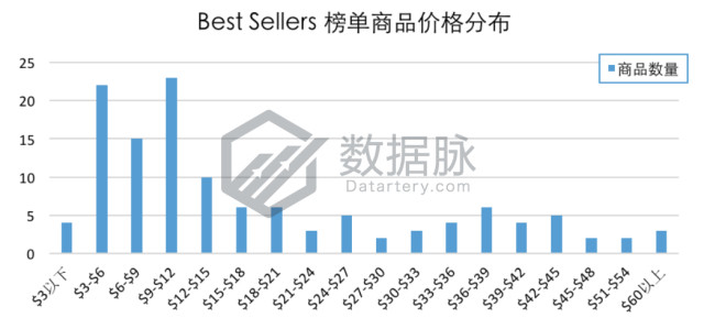 上周Office Products品类Best Sellers榜单商品最高价$64.9,最低价$0.58,平均价格$19.72。骆探长(shujumai.com)发现,其中定价在$9.00-$12.00价格区 间的商品数较多,占了上榜商品总数的16.67%;同时,也有不少上榜商品价格分布于$9.00-$12.00区间内,占比上榜商品总数的15.94%。在高价格段,上周仅有3款上榜商品价格超过了$60.00,占比2.17%。相比该品类的上期分析,该周进榜Best Sellers榜单的商品平均价格出现回暖,高价商品进榜机会增加。