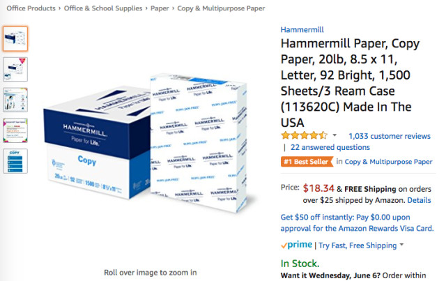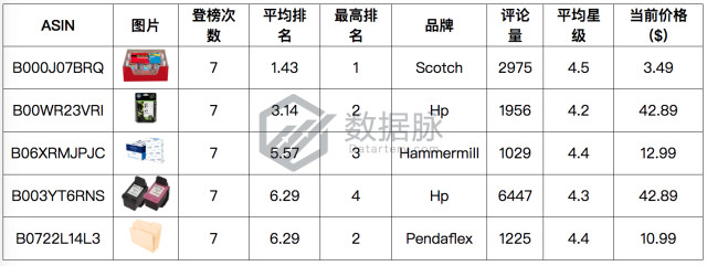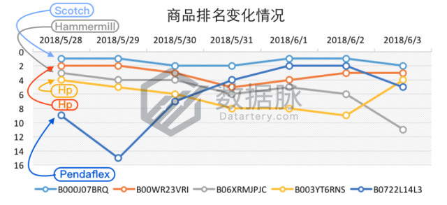 骆探长(shujumai.com)发现,在上周Office Products品类的Best Seller榜单中,除了品牌Sotch的运输包装胶带产品与品牌Hp的墨盒产品继续保持不错的榜单表现之外,一款来自品牌Hammermill的复印纸套装产品也在该周 的前半段时间中维持着相对稳定的榜单发挥,多次进入榜单前五,虽然在6月份之后,该商品的榜单排名持续下降,但仍以一周平均排名5.57的成绩,位列商品综合排名第三。