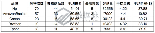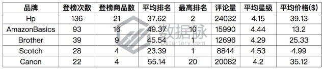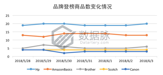 可以看到,上周Office Products品类的Best Sellers榜单品牌竞争中,品牌Hp与AmazonBasics分别夺得了136次与93次进榜,继续稳坐品牌综合排名前两位。此外骆探长 (shujumai.com)发现,另外三个大品牌——Brother、Sotch、Canon也在上周的品牌竞争中取得了不错的榜单成绩,分别位居品牌综合 排名的第三、四、五位。