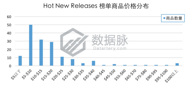 上周Office Products品类Hot New Releases榜单商品最高价$199.99,最低价$1.9,平均价格$18.2。其中,有29.41%的商品定价于$5.00-$10.00区间,同时有18.82%的上榜商品定价在$10.00-$15.00区间。此外骆探长(shujumai.com)发现,在上周进入Office Products品类Hot New Releases榜单的商品中,有3款商品的定价超过了$100.00,占上榜商品总数的1.76%。