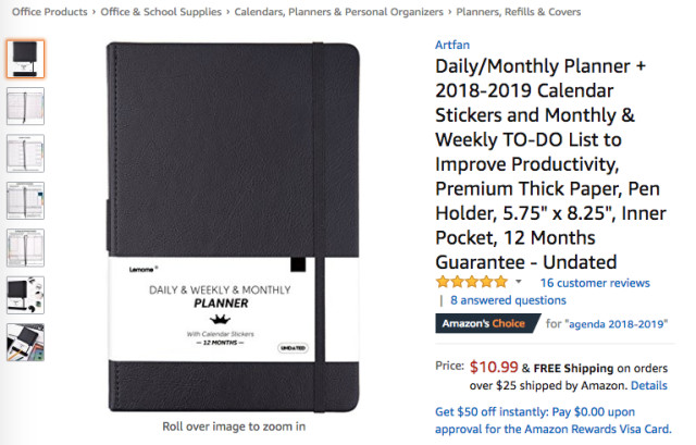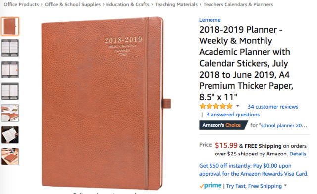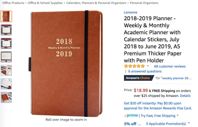 可以看到,在上周Office Products品类的Hot New Releases榜单中,品牌Lemome的2018-2019日历笔记本产品成为了该周新品榜中的最大赢家——其中,页面尺寸为A5的笔记本产品在一周内六次跻身榜单前 三,以绝对的排名优势位居综合排名第一,骆探长(shujumai.com)注意到,目前该款商品仅拥有43条消费者评论,且评论星际高达5.0,商品后续的 市场潜力值得期待;