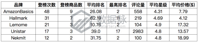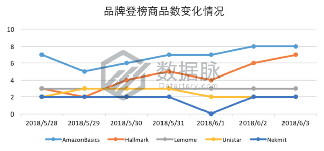 根据上周Hot New Releases榜单上各个品牌下商品的登榜次数,我们对登榜的品牌进行了排序,其中排名靠前的五个品牌如下所示: