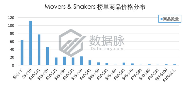 上周Office Products品类Movers & Shakers榜单商品最高价$395.0,最低价$0.01,平均价格$18.75。其中,价格在$5.00-$10.00之间的商品数量较多,占上榜商品总数的 24.78%,另有17.19%的上榜商品定价于$10.00-$15.00价格段。此外骆探长(shujumai.com)发现,上周仅有2款商品的价格超过$100.00,站上榜商品总数的0.45%,相较于前几期分析,该周价格过百的上榜商品数略有减少,上榜商品的整体平均价格有所下降,低价商品在短期 BSR排名的冲击力方面略胜一筹。