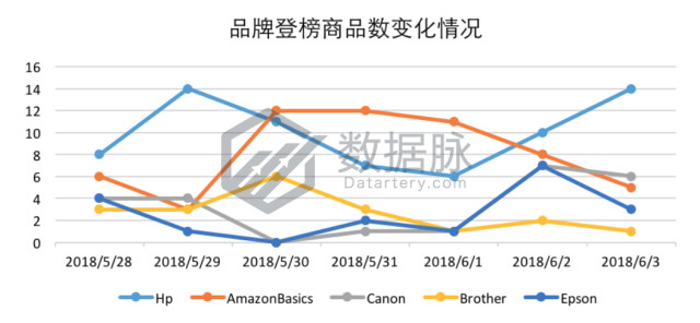 在上周Office Products品类的Movers & Shakers榜单中,两大品牌继续展开激烈竞争。最终,品牌Hp凭借在5月29日与6月3日两天中单日上榜15款商品的稳定表现,以一周总登榜次数70次的成绩成功战胜 老对手AmazonBasics,占据品牌综合排名第一;后者则以一周57次登榜的成绩暂居品牌综合排名第二。此外,品牌Canon、Brother、 Epson也在上周取得了不错的进榜成绩,分别位居品牌综合排名的三、四、五位,骆探长(shujumai.com)发现,三个品牌的主营产品皆为办公电子设 备的更换配件产品,相关市场值得卖家关注。