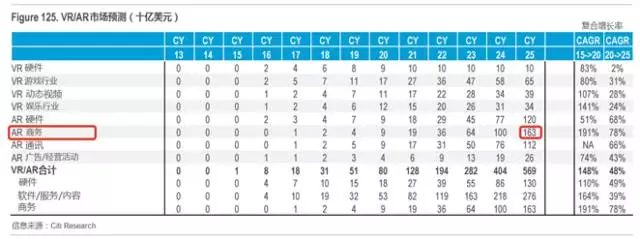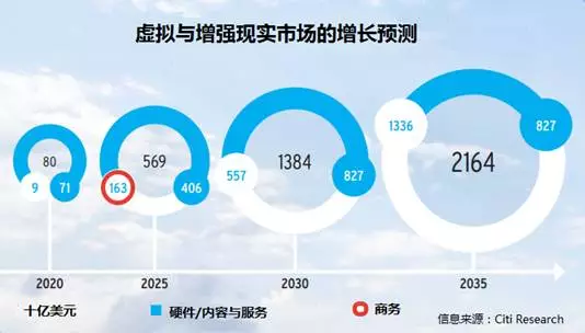 据花旗集团(Citi Group)发布的《虚拟与增强现实》调查报告结果显示,至2025年增强现实市场的商业板块规模会增至1630亿美元,预计占电子商务市场规模的5.8%(据专家评估,2025年电子商务市场规模会达2.8万亿美元)。至2035年增强现实商业板块规模会增至1.3万亿美元,其在电商市场的份额会达28%。