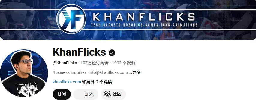 YouTube 科技创作者 @KhanFlicksz 是典型的展会科技盘点型博主,账号长期聚焦 CES、前沿科技产品、机器人与未来科技趋势,粉丝规模约107W。
