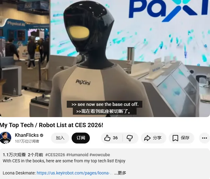 其视频 My Top Tech / Robot List at CES 2026! 将帕西尼纳入“CES 2026 最值得关注机器人”清单中,内容以 展会精选+亮点筛选 为主,重点突出机器人实际能力与差异化表现。该视频播放量约为1.1w,其通常覆盖更广泛的科技兴趣人群(不仅限机器人从业者),在“看展总结”场景中帮助帕西尼进入更大范围的科技受众视野,属于典型的破圈型补充传播。这类内容的营销价值在于:不需要深度解释技术,也能让用户形成“帕西尼 = CES重点玩家”的第一印象。
