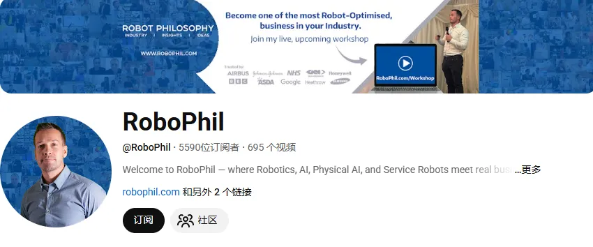 YouTube 机器人观察型账号@RoboPhil,账号核心定位是 Robotics、AI、Physical AI(具身智能)、Service Robots,内容长期围绕机器人产业趋势、展会观察和服务机器人展开,风格比泛科技号更垂直、偏行业视角。该账号目前约有 5.59K 订阅者。