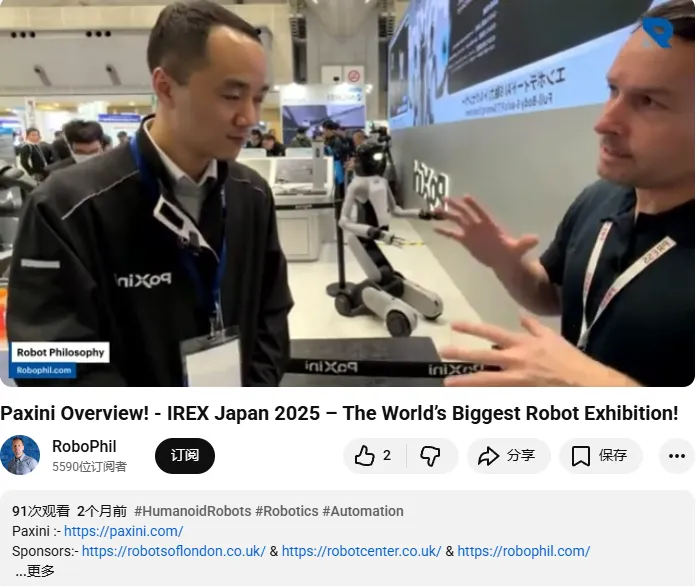 对应的帕西尼相关视频链接为 PaXini Overview! - IREX Japan 2025。这条视频不是简单路过式拍摄,而是以 iREX Japan 2025 展台overview 为切入点,围绕帕西尼在展会中的具体展示进行概览式讲解。这条视频目前约 90 views。它帮助品牌把“触觉感知、人形机器人、Physical AI”这些较高门槛的概念讲得更清楚。